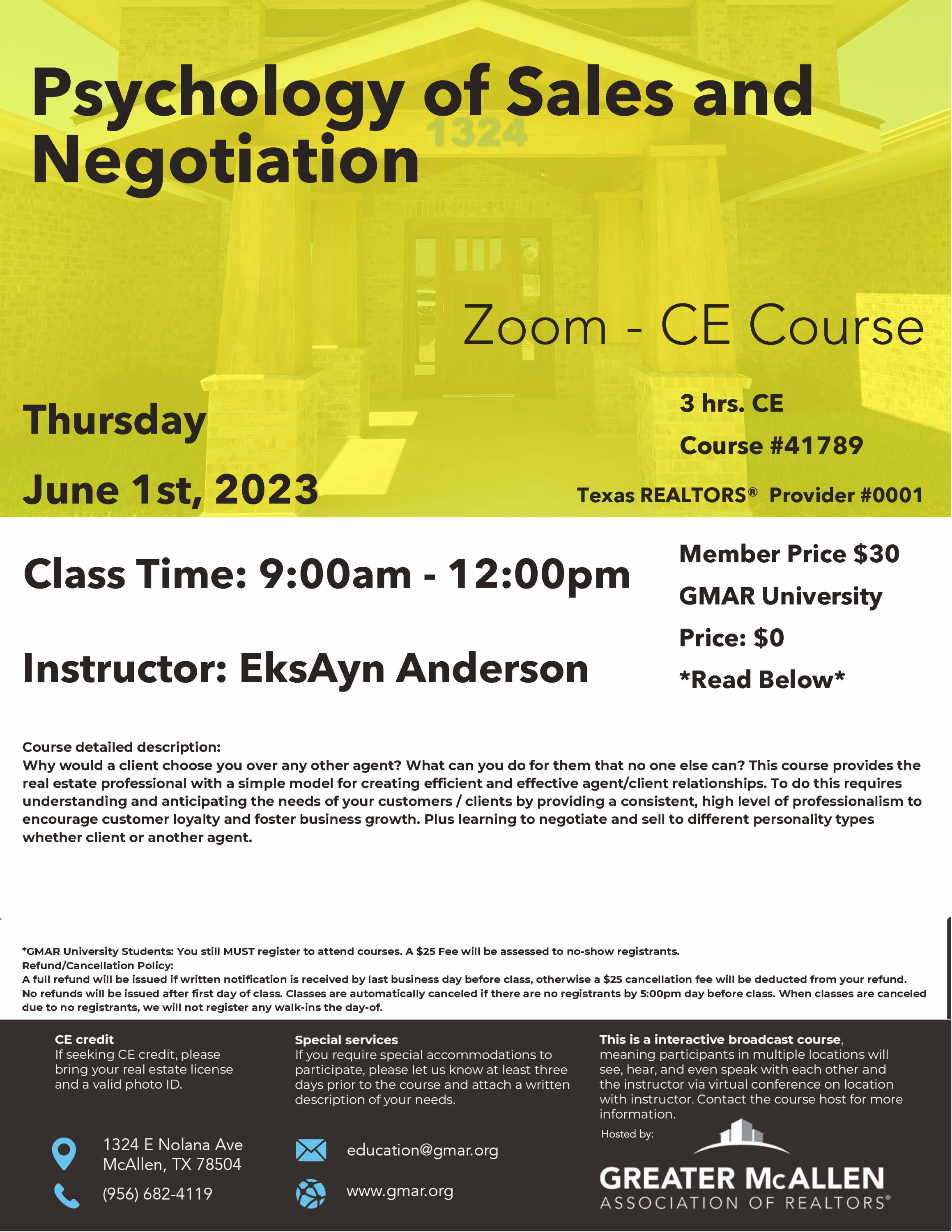 Why would a client choose you over any other agent? What can you do for them that no one else can? This course provides the real estate professional with a simple model for creating efficient and effective agent/client relationships. To do this requires understanding and anticipating the needs of your customers / clients by providing a consistent, high level of professionalism to encourage customer loyalty and foster business growth. Plus learning to negotiate and sell to different personality types whether client or another agent. Provider Name: Texas REALTORS® #0001 Course Number: 41789 Instructor: EksAyn Anderson CE Credit: 3Images